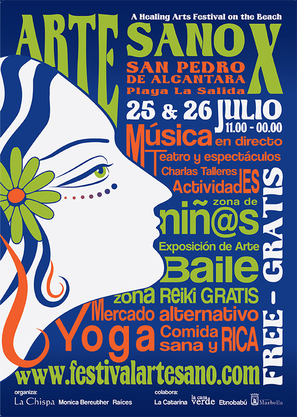 Festival Arte Sano, one of the coast’s most popular summer festivals celebrates its 10th edition over the last weekend of July on the San Pedro sea front. This year the healing and performing arts festival looks back to the 1960s and 1970s with its poster design, evoking an era of free festivals, flower power, peace and love and psychedelia.